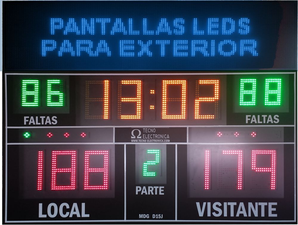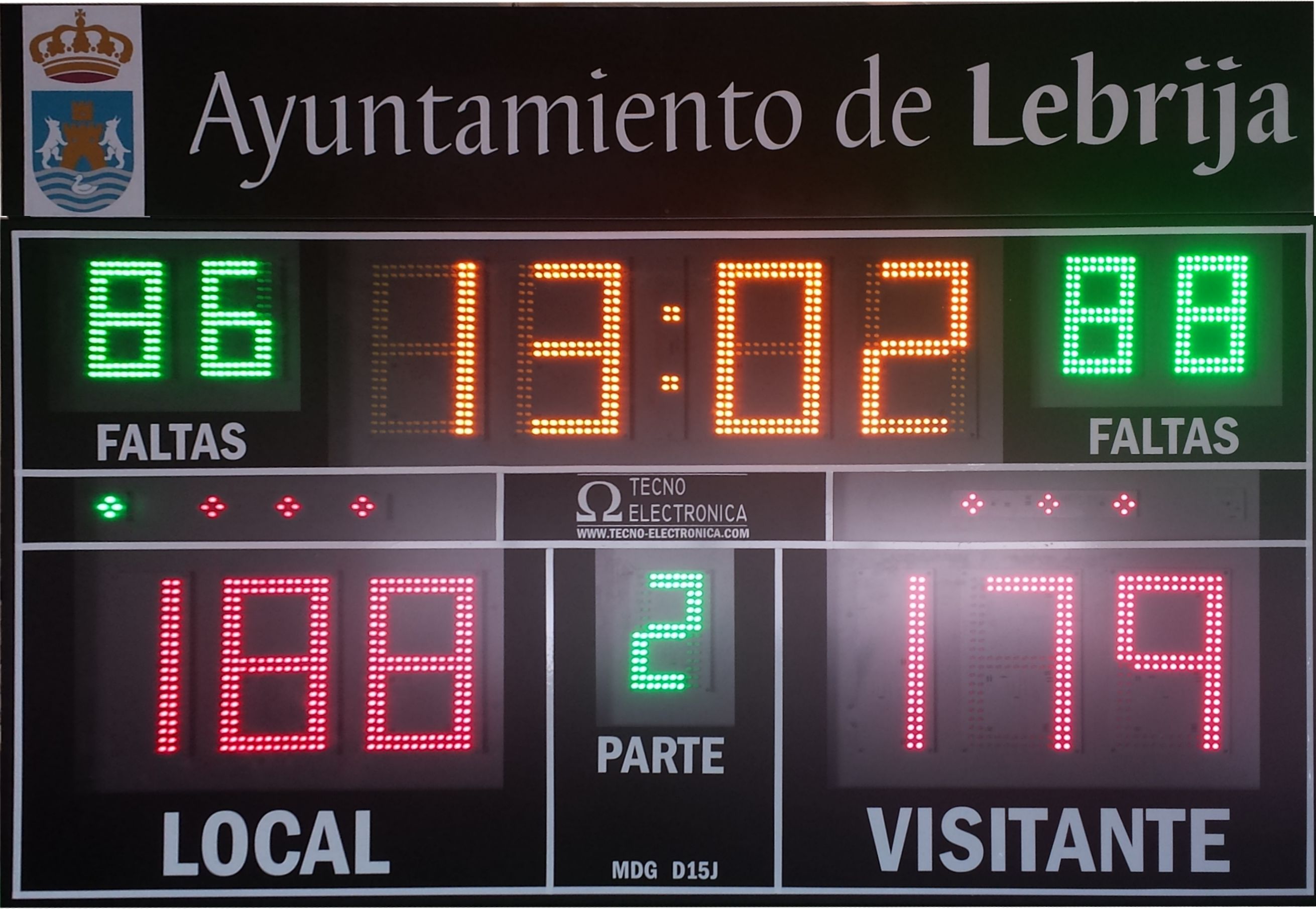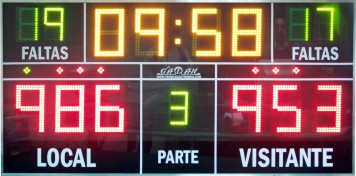 - Seis dígitos de 27 cm. de altura para puntuación (tres para equipo local y tres para el equipo visitante) con cuenta de 0 a 199 puntos.