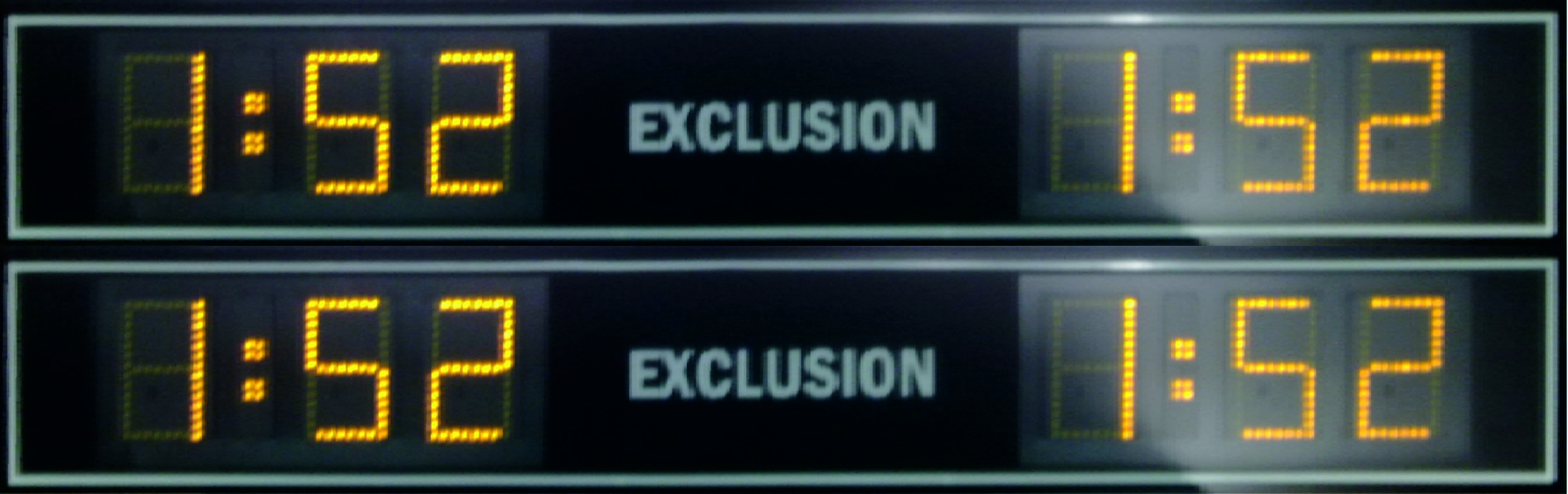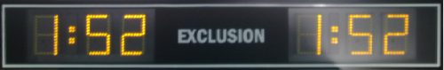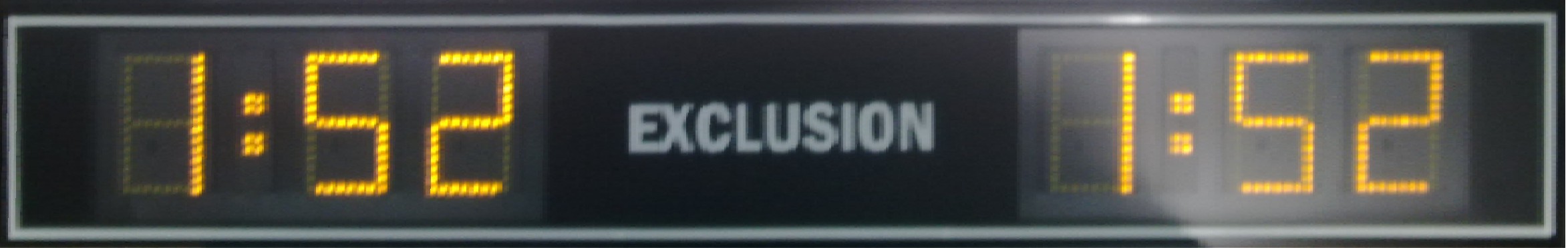 Pantalla para expansión del marcador principal formada por seis dígitos de 18 cm. de altura para la indicación de dos cronómetros con cuenta regresiva de dos minutos para la indicación de los tiempos de exclusión de los jugadores de ambos equipos. Los datos reflejados corresponden a los jugadores que les resta el menor tiempo de exclusión.